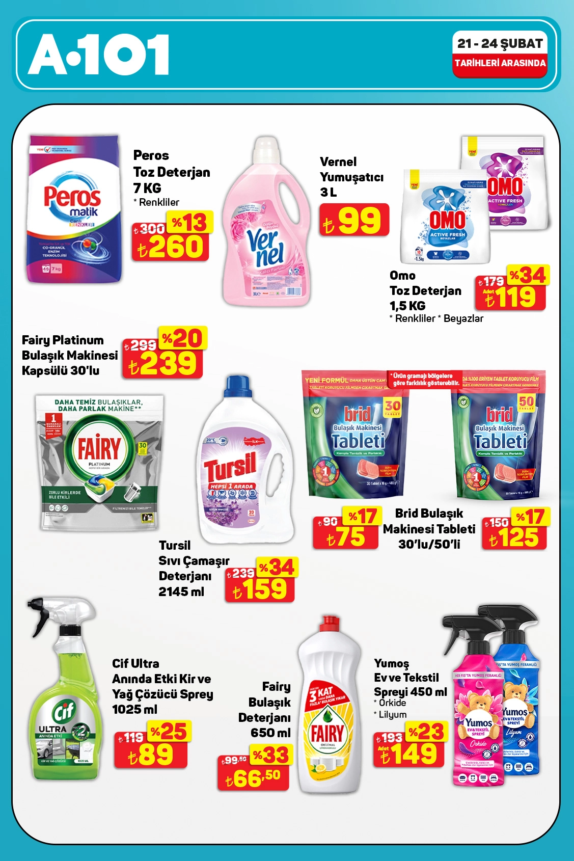A-101 marketlerinde 21-24 Şubat tarihleri arasında geçerli olan indirimli temizlik ürünleri ve güncel fiyat listesi aşağıda sunulmuştur