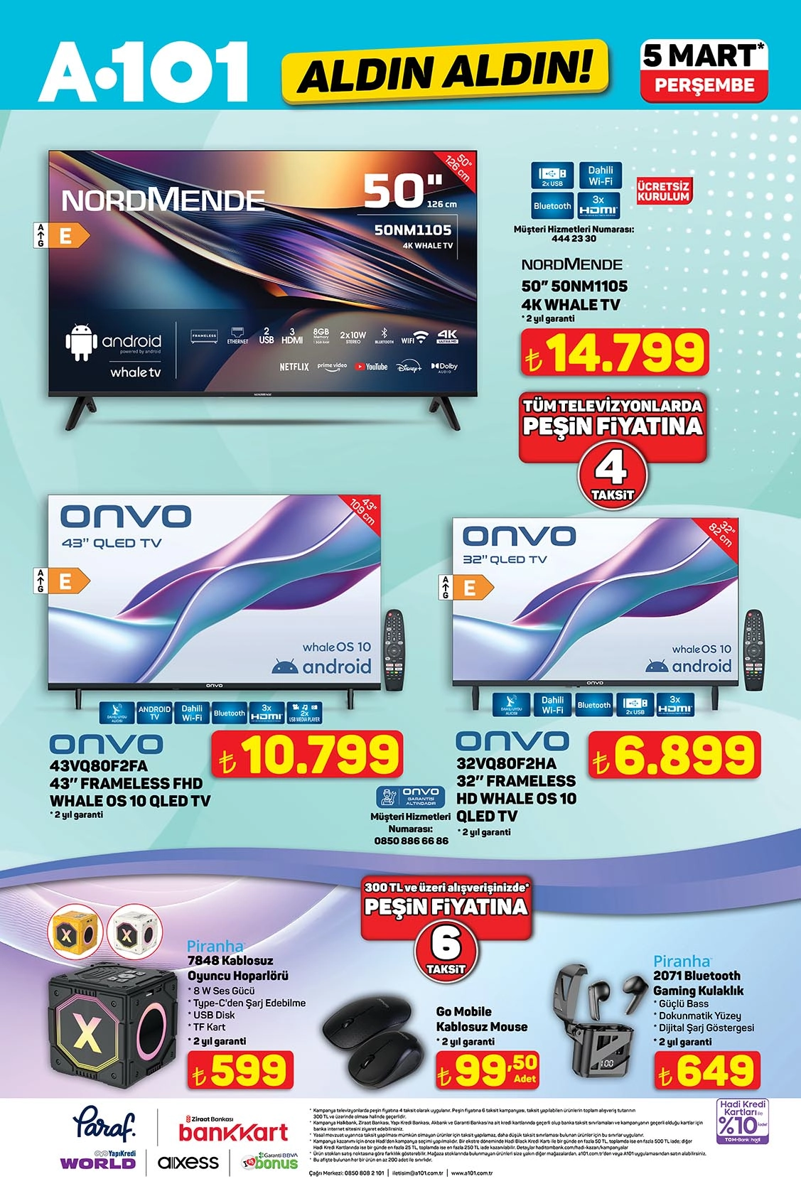 A101, yüksek tutarlı alışverişlerde tüketicinin yanına oluyor. Televizyon alımlarında peşin fiyatına 4 taksit imkanı sunulurken, diğer ürünlerde 300 TL ve üzeri alışverişler için 6 taksit seçenekleri mevcut. Hadi Kart kullanıcıları için ise ekstra iade (cashback) fırsatları devam ediyor; alışveriş yapmadan önce uygulamanızı kontrol etmenizde fayda var.
