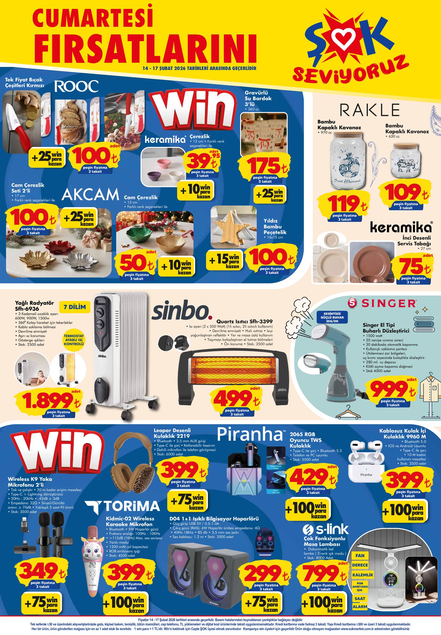 Şok Marketler tarafından 14-17 Şubat 2026 tarihleri arasında satışa sunulan, teknoloji ve ev gereçlerinden oluşan güncel ürün kataloğu aşağıda bilgilerinize sunulmuştur
