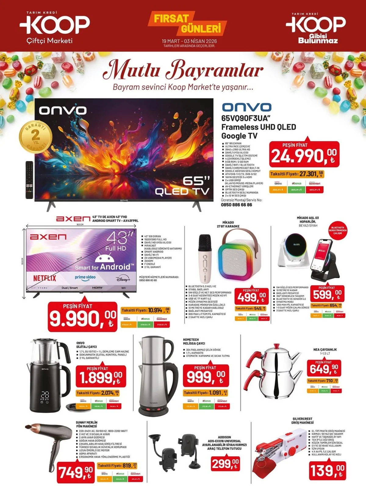 19 Mart - 3 Nisan 2026 Tarım Kredi Aktüel Ürünler - Onvo 65 İnç QLED TV ve Axen Smart TV