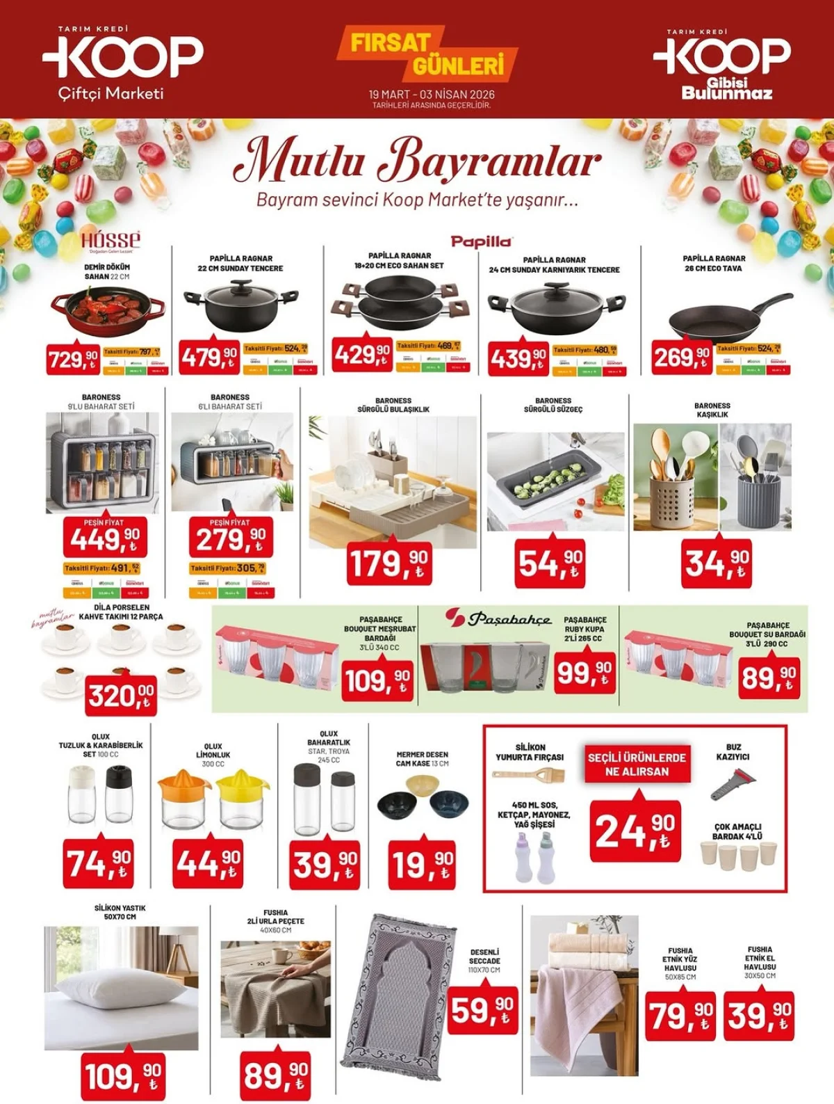 Tarım Kredi Kooperatif Marketleri, yaklaşan bayram öncesinde mutfak ihtiyaçlarını karşılamak ve evini yenilemek isteyenler için yeni "Fırsat Günleri" kataloğunu duyurdu. 19 Mart ile 3 Nisan 2026 tarihleri arasında geçerli olacak bu kampanya döneminde, özellikle mutfak gereçleri ve sunum ürünlerinde dikkat çekici bir çeşitlilik sunuluyor. Bayram hazırlıklarının hız kazandığı bu günlerde, kaliteli markaların uygun fiyatlarla raflara gelmesi tüketiciler için büyük bir avantaj sağlıyor.